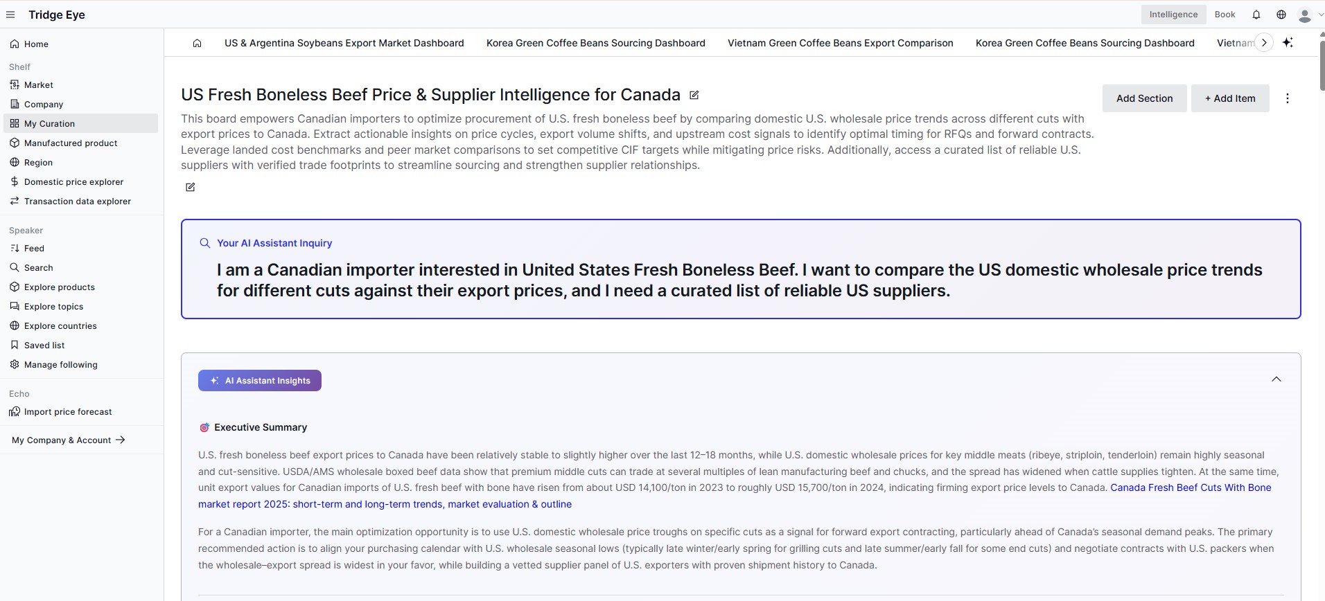 The core of My Curation is its extreme efficiency and personalization. Users simply describe their needs in the chat—for example, "Create a sourcing strategy for U.S. fresh boneless beef as a Canadian importer."