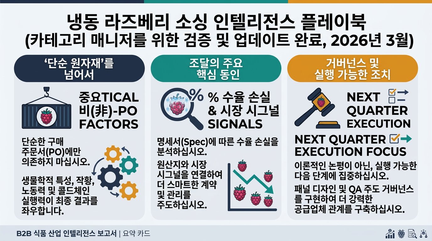 냉동 라즈베리는 발주서(PO)에서만 “단순 커머디티”처럼 보입니다. 실제 성과는 생물학(작황 + 노무), 여러분의 스펙이 만드는 수율 손실, 콜드체인 실행력에 의해 좌우됩니다. 그래서 최고의 구매 의사결정은 시장/산지 신호를 계약 구조, 패널 설계, QA 중심 거버넌스로 연결하는 데서 나옵니다. 이 플레이북은 Purchase – Product & Category Management 팀을 위해 작성되었으며, 냉동 라즈베리 경험이 상대적으로 적은 구매 전문가가 “다음 분기 무엇을 할지”에 바로 쓸 수 있도록 구성했습니다(이론적 시장 코멘터리가 목적이 아닙니다).
