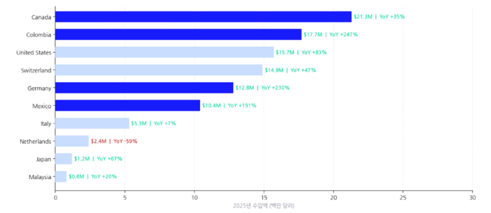 [2025 상위 수출국: 캐나다·콜롬비아·미국·스위스·독일 Top5 집중]